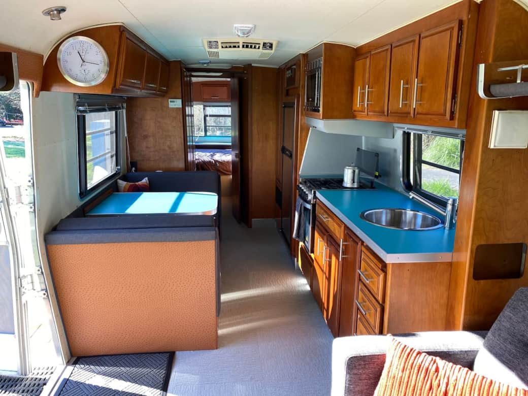 The camper has a full kitchen, with a gas stove, oven, microwave, and small fridge as well as basic cookware. There’s also weber style BBQ outside as well. We provide wood but not charcoal. There is a private hot tub, patio area, and vast open green space for outdoor relaxing.